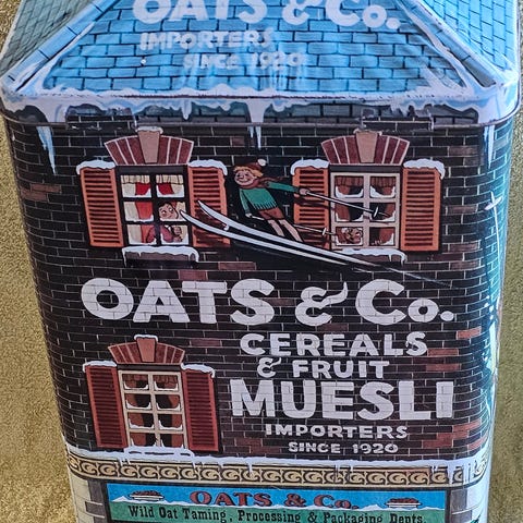 Gammel metallboks i nydelig lyseblå farge. Litt bulkete og merker etter mange års bruk gjør den bare ekstra sjarmerende. Lapp med teksten «hvetemel» er klistret på lokket. Se mål på bilder.