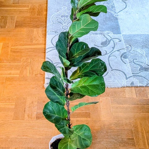 Stor frisk fiolinfiken selges uten pyntepotte. 110cm høy. Den behøver ompotting fordi røttene har vokst ut gjennom bunn i potten.