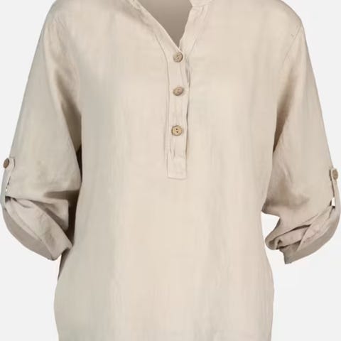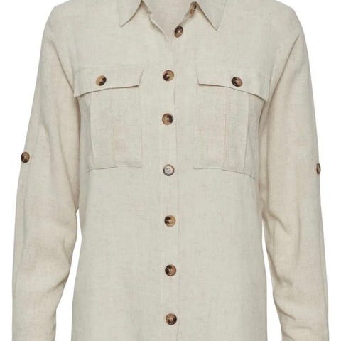Skjorte i lin- (80%) og viskoseblanding (20%) med en klassisk grov lin-tekstur. Stoffet er uten stretch, og vil vide seg noe ut etter bruk og vask. Skjorten har nedbrettet krage og knapper nedover front. Den har halvlange ermer med ekstra lav skuldersøm for en noe oversized look. Skjorten har en avrundet form nederst på baksiden, og er lenger bak enn foran.