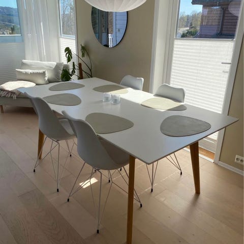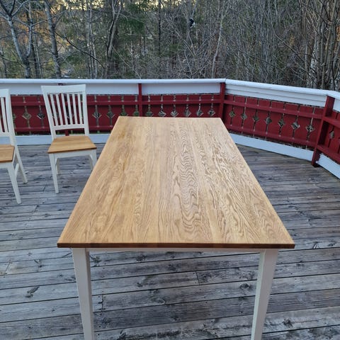 Selger spisebord med 8 stoler.Veldig pent brokt.Stolene er ny trukket i svart skinn.To stoler er med armlener. Er små bruksmerker på bordflaten. L-172cm. H-76 cm.B-107 cm.
