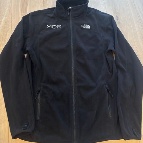 Glidelåsene har grønne detaljer. Litt slitasje på detaljen ved venstre lomme (se bilde) og noen flekker inni lommene (ikke synlig utenfra).