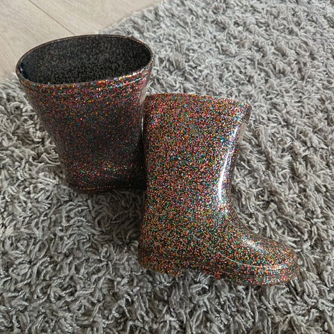 Barnestøvler i størrelse 25, rosa farge med regnbue- og stjernemønster. Laget av vanntett materiale med gummisåle for godt grep. Utstyrt med snorstramming øverst for bedre passform.