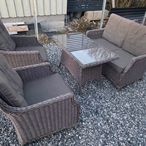 Selger flotte og solide hagemøbler i eksklusiv rund plastrotting. Settet består av 2 sofaer, 2 stoler og et stort bord.