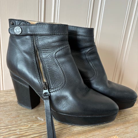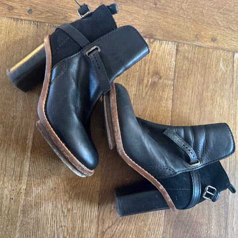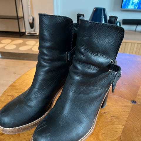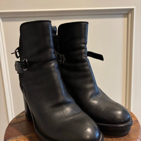 Acne Studios støvler i svart skinn, størrelse 36 for dame. Støvlene har en høy hæl og spenne detalj på siden. Slitesterk såle med synlig slitasje på hælen. Hempe til spennen ødelagt på den ene støvelen.