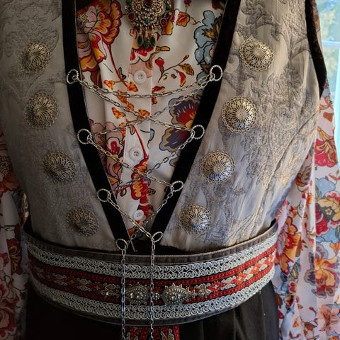 Festdrakt med tilbehør. Tilbehør er belte, drakjede, brosje og bluse. Belte festes med hekter som kan flyttes etter livmål. Bluse og drakt er svart. Hvis du vil ha med jakke på 2 siste bilder må du legge inn bud på 2000. Mål bryst ca 104cm, midje ca 92. Beltelengde 112cm. Kan sendes for kr 69, hvis kjøpesum og porto forhåndsvippses.