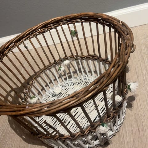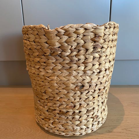 Flettet kurv i tre. Dekorativ og romslig i praktisk størrelse. Litt gråaktig trefarge. Lokk som sitter fast og to fleksible bærehåndtak. Litt rustikk look.