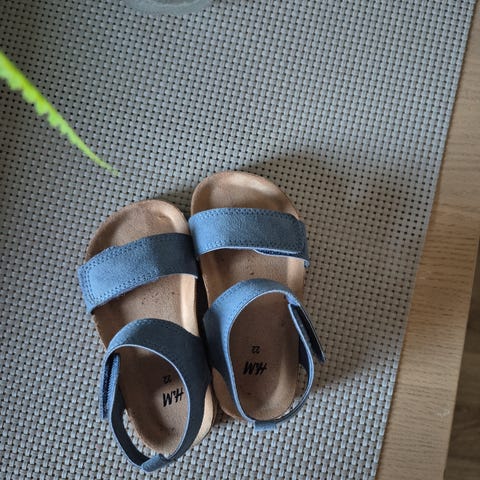 H&M sandaler for barn i størrelse 22. Sandalene har blå farge og er designet med to borrelåsremmer for enkel justering og komfort. Egnet for daglig bruk i varme værforhold.