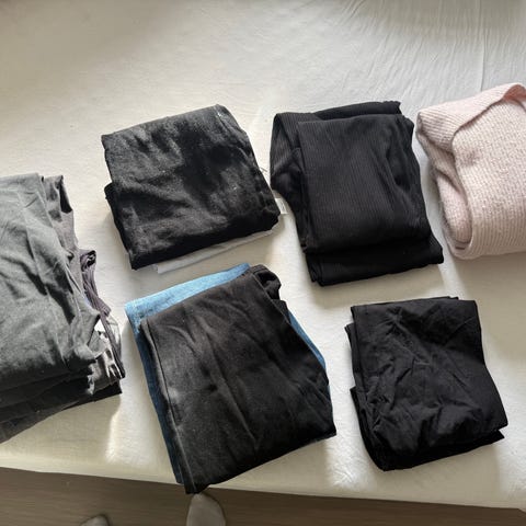 Et av plaggene er helt ny og ubrukt. Flere av klærne er svært lite brukt, så de er som nye. Og på noen av plaggene kan det forekomme noe slitasje.