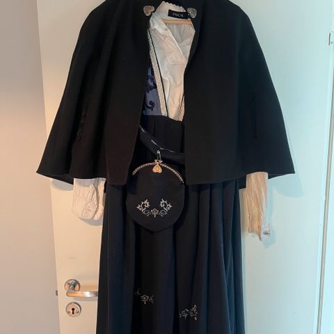Kystdrakt for dame i størrelse L i grå farge. Sett består av stakk og liv i grått med folder, hvit bunadskjorte med broderi ved hals og mansjetter, mørk blå ullvest eller cape med broderte blomster, samt grå bunadspose med broderi og mørk blå livrem. Det følger med bunadssølv bestående av halsknapp, to brystknapper og mansjettknapper i oksidert sølvfarge. Bunaden passer til høytidelige anledninger og tradisjonelle markeringer. Ingen opplysninger om merke eller modell er oppgitt.