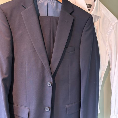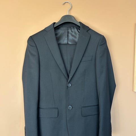 Slim fit dress fra Dressmann. Brukt et par ganger. Jakke str 42 og bukse str W28/L30. Buksen er sydd inn 2cm i midjen, men kan legges ut igjen.