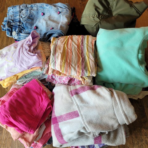 Pent brukt klespakke med blant annet 3 sett og ett sommerlig sett. Blå/grønn skjørte har en liten flekk ved knepping.