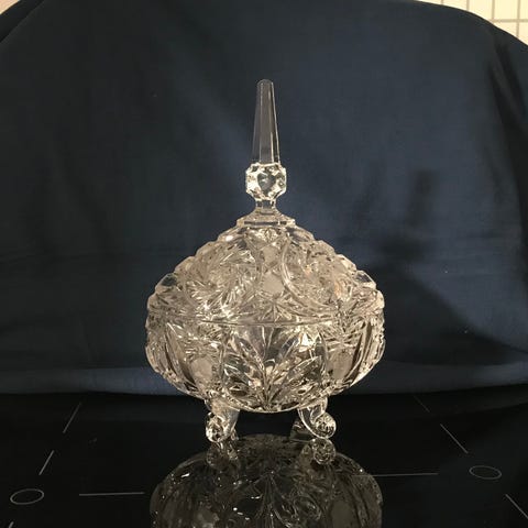 Vintage krystallskål perfekt til for eksempel syltetøy, sukker, eller godteri. Skålen er laget av slipt krystallglass og har et detaljert fint mønster.