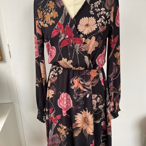 Floyd Kjole til spesiell anledning i størrelse M, farge svart med blomsterprint. Kjolen har lange ermer og en omslagsdesign med v-hals. Materialet er lett og egnet for formelle eller spesielle anledninger. Ikke brukt, bare tatt av prislappen.