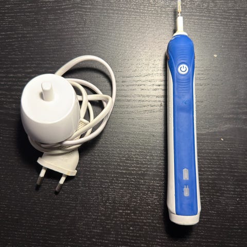 Elektrisk tannbørste i hvit og blå farge. Leveres med ladestasjon og ekstra børstehode. Passer for daglig munnhygiene. Kan sendes mot frakt.