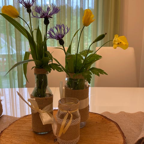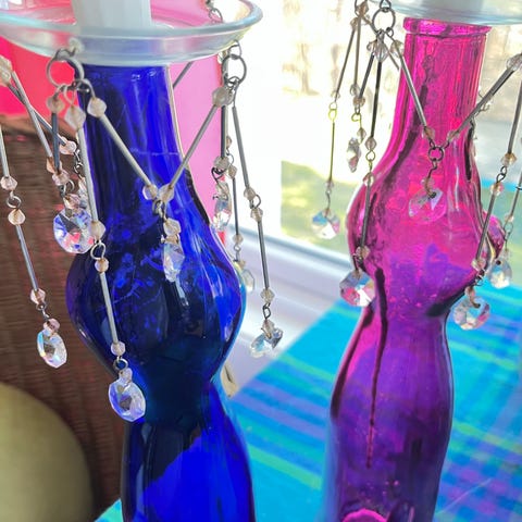 Dekorasjon / pyntenett med «perler» for flasker eller lignende gjenstander.