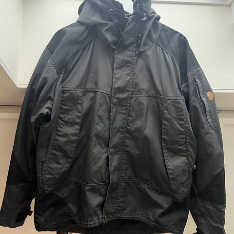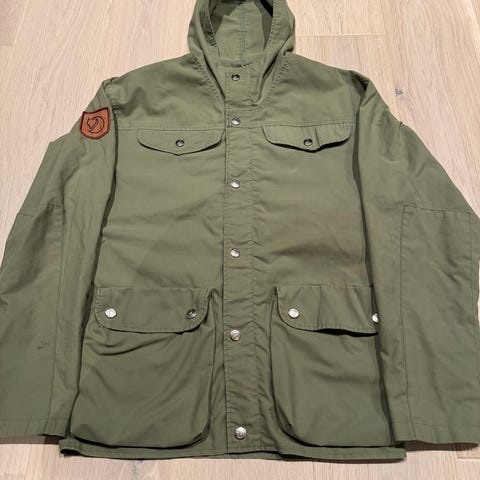 Veldig fin Fjällräven-jakke i størrelse L for menn, fargen grønn. Jakken er designet for utendørsbruk og har en hette med pelskant. Materialet og detaljer er tilpasset for å gi beskyttelse mot vær og vind. Pent brukt, men glislåsen er noe slitt nederst, se bilde.