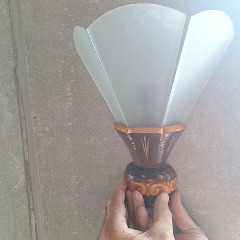 Unikt bordlampe. Bladene kan foldes ut og inn. Se foto. Indre og ytre kronblader. Gammeldags lyspære m liten sokkel se bilde. Noen av denne modellen hadde små blomster nederst. Det har ikke denne. Ellers fremstår den uten feil og er veldig pen m lys i. Lagd ca 1950-1960.