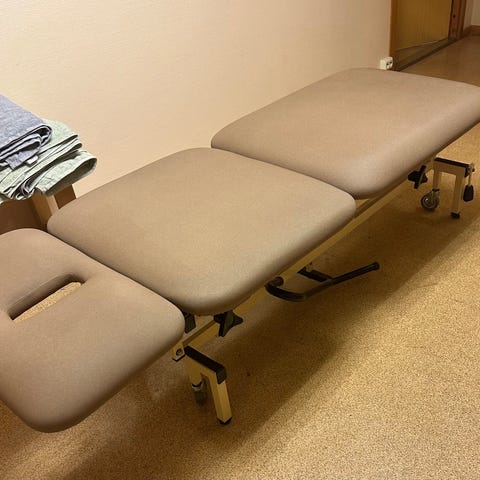 Elektrisk behandlingsbenk med justerbar ryggstøtte og benstøtte i beige farge. Benken har polstret overflate og armlener, samt hjul for enkel flytting. Egnet for medisinsk bruk, massasje eller behandling. Justerbar høyde og flere posisjoner for tilpasning til ulike behandlingsbehov.
