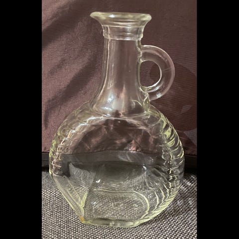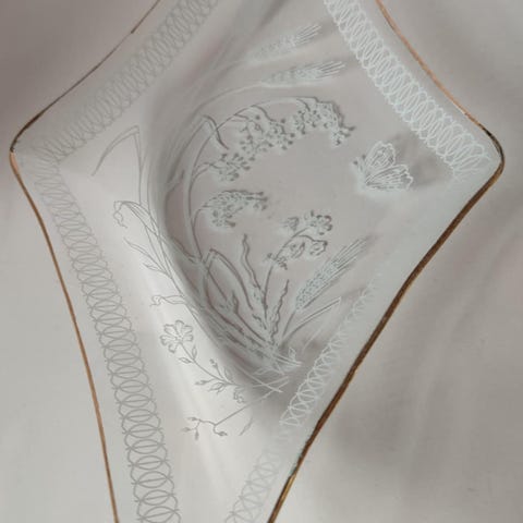 Skålen/ fatet på bildet er en glasskål fra Jeannette Glass Company. Selskapet, som ble grunnlagt i Jeannette, Pennsylvania i 1898, er kjent for å ha produsert kjøkkenutstyr og servise, inkludert depresjonsglass fram til 1900 tallet. Bollen/ fatet har litt avskall på to av beina (står fint rett alikevel og er ikke synlig) og en liten og en litt større luftblære. Fortsatt et elegant fat.