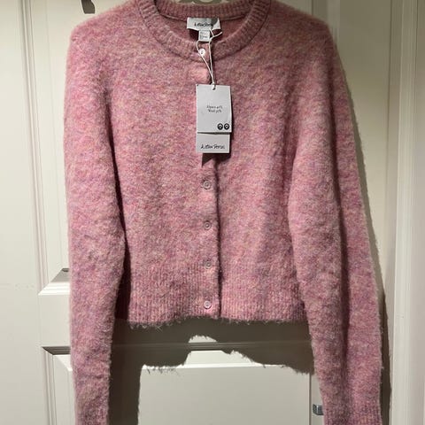 Cardiganen er lite brukt, størrelse M, men passer også til L. Inneholder mohair og ull. Uten knapper. Har to lommer.