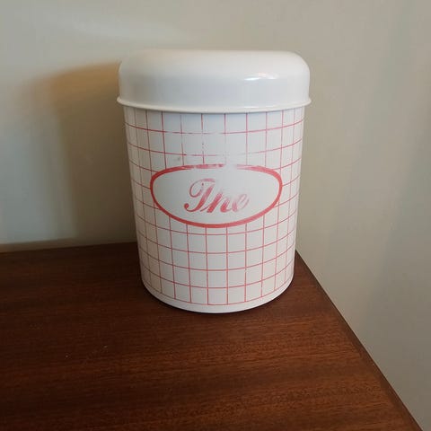 Superfin vintage mel-boks i rød og hvit med tidløst rutemønster og tydelig tekst.