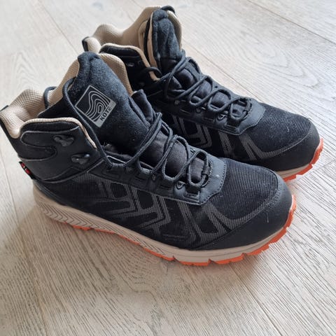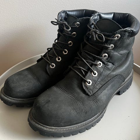 vinterstøvler i svart lær, størrelse 43. Støvlene har solide såler med godt grep, snøring foran og polstret ankel for komfort. Egnet for bruk i kalde og våte forhold.