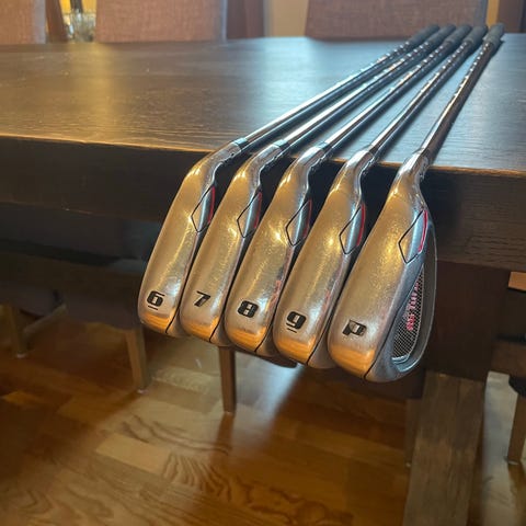 Merk: 7-jern og sand wedge følger ikke med. Dessverre har jeg mistet 7'er jernet og aldri hatt sand wedge.