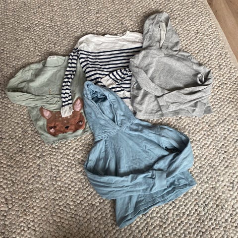 Klespakke med to gensere tilsvarende str 134/140 selges.