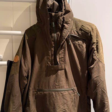 Pinewood Active Hydrowind jakke og bukse i camouflage mønster, størrelse XL. Jakken har oransje detaljer for synlighet og er laget for utendørs bruk. Buksen har elastisk midje og forsterkede partier for økt slitestyrke. Passer for jakt og andre aktiviteter i naturen.