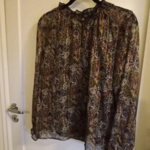 Pen overdel selges kr. 80. Str S tilsvarer 44 Fargene som går igjen er ulike høstfarger.