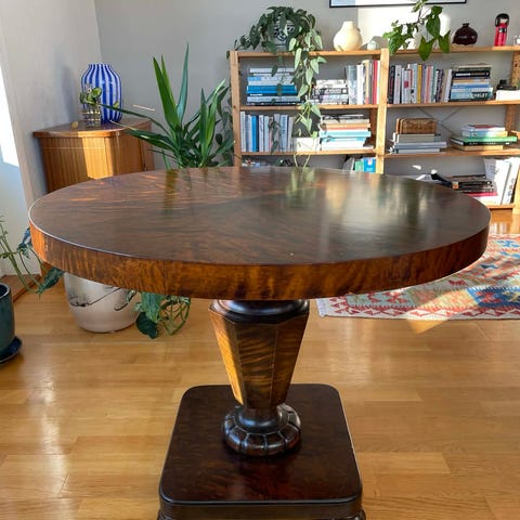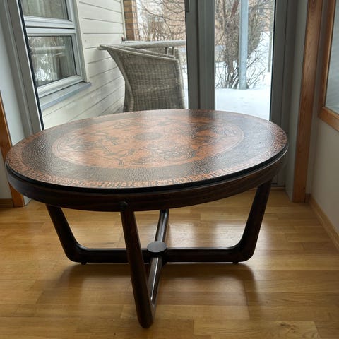 Pent brukt bord . Tidsriktig brun beiset eik på understell. Fliselagt bordplate i brun og blåfarge.