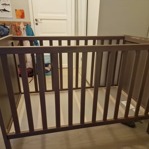 Kan brukes både som sprinkelseng og som sideseng til voksenseng uten den reparerte sideveggen.