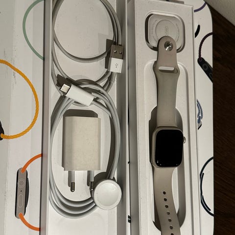 Apple Watch S9 41mm GPS (Starlight Alu/Starlight Sport Band) S/M. Beige. Klokken ble kjøpt i desember 2023, klokken er lite brukt uten synlige merker.