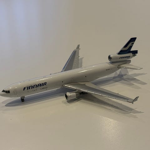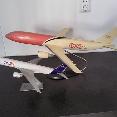 FedEx modellfly av plast med stativ. Flymodellen er detaljert med FedEx-logo og farger, designet for å stå på et stativ for visning. Passer som samlerobjekt eller dekorasjon.