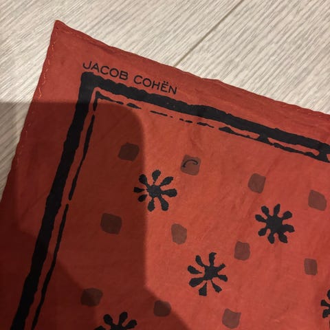 Rødt skjerf fra Gant. 50x50cm. Laget av 100% bomull. Skjerfet har mønster med stjerner og striper. Helt nytt med lapp!