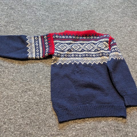 God håndstrikket ullgenser med Mariusmønster. Rinbestrikk i boken og på ermene, som gir god passform.