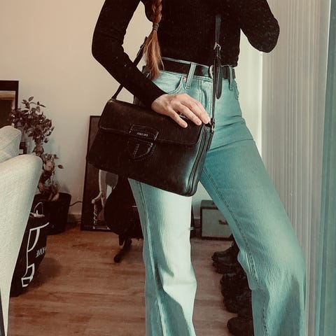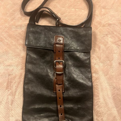 Prada skulderveske laget av lær, designet for unisex bruk. Vesken har en justerbar skulderrem og lukkes med klaff. Materialet er glatt lær med diskret logo på forsiden. Passer til daglig bruk og ulike anledninger.