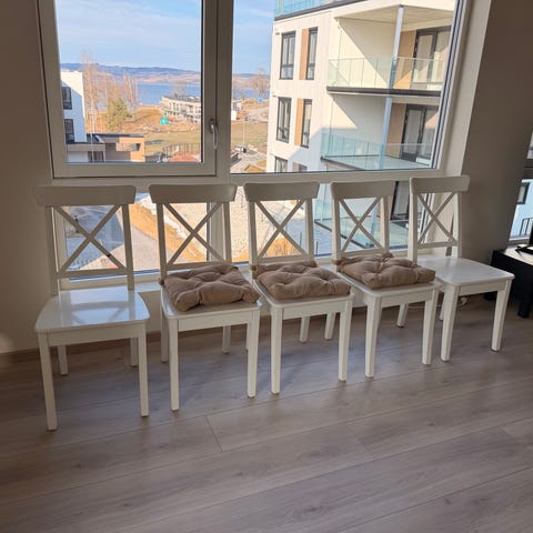 To spisestoler fra IKEA. Hvitmalte tre stoler, Behøver et strøk maling og noe stramming av skruer.