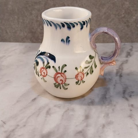 Vakker, håndlaget mugge med myk blomsterdekor i duse retrofarger.