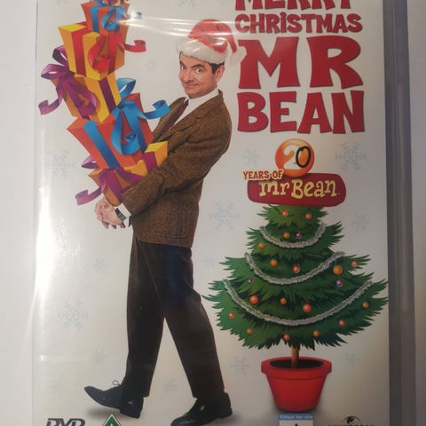 Mr. Bean Christmas DVD featuring the character Mr. Bean in a holiday-themed episode. The DVD cover shows Mr. Bean holding gifts next to a decorated Christmas tree. Suitable for fans of the Mr. Bean series and holiday entertainment.
