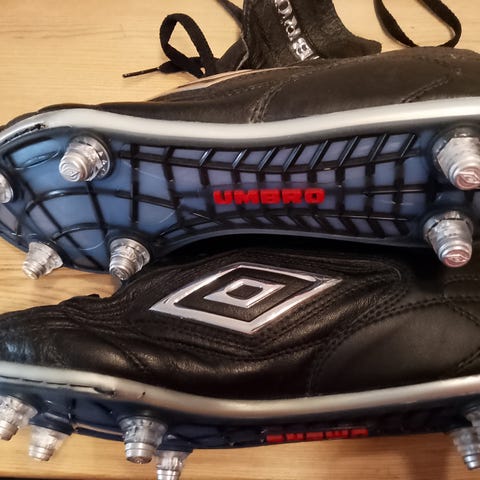 Umbro fotballsko (piggsko) i størrelse 42. Skoene er svart og rød med knotter med stål på undersiden for bruk på gressbaner. Laget for fotballspill, designet for å gi godt grep og støtte under spill.