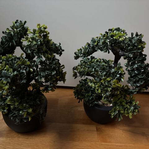 Selger 2 kunstige planter med realistisk utseende. Grønne blader, vridde stilker og gjennomsiktige potter med imitasjonsjord og røtter. Perfekt som dekor i stue, gang, kontor eller butikk. Vedlikeholdsfri og allergivennlig – trenger ikke vann eller sollys.