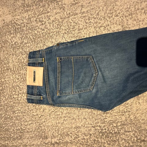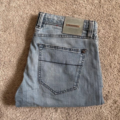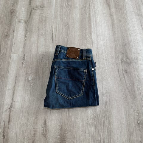 Trammarossa jeans for herre i størrelse W31 og S. Fargen er blå, laget av bomull. Jeansene har klassisk design med lommer bak og detaljer i sømmer. Den stitchen bak faller litt av men lett og fikse😊