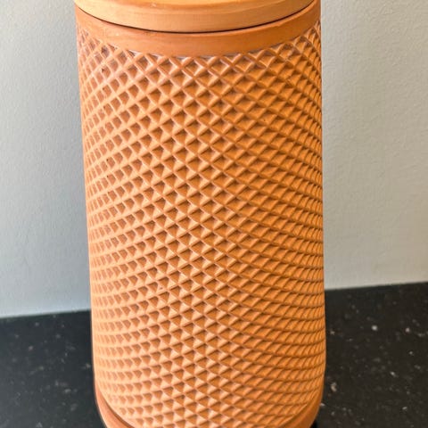 lite bosspann i rosa farge med trykk lokk. Har en ribbet design og en gullfarget kant rundt åpningen. perfekt på pulten eller som søppelbøtte på badet/toalettet. anbefales å ha en liten pose oppi for å holde det rent og pent ;) HELT nytt , ubrukt!
