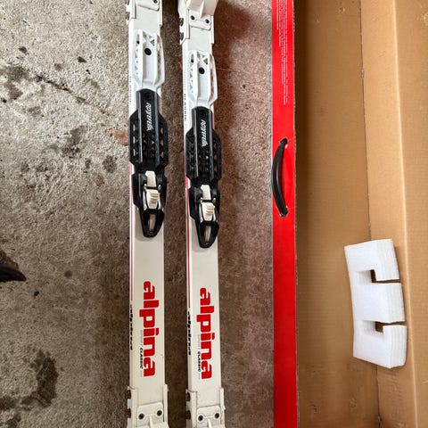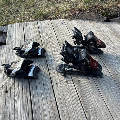 Marker Griffon ski binding sett bestående av to bindinger og tilhørende deler. Bindingene er hvite med svart og rød logo. Designet for bruk med alpinski.