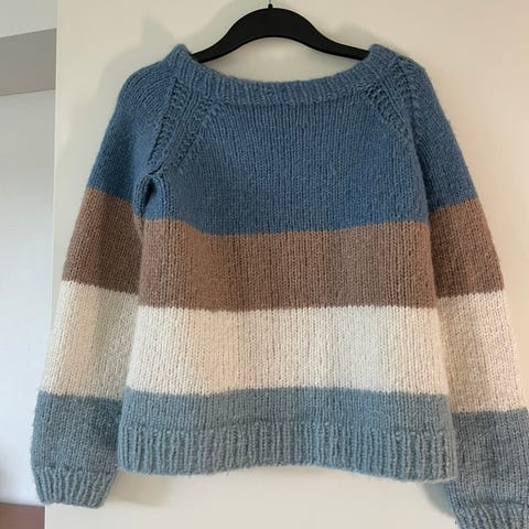 Hjemmestrikket genser, str. S/M; veldig fin stand:) ingen flekker eller skader; myk ullgarn som ikke klør; litt oversized/boxy passform, lange og smale ermer, båtutringning;