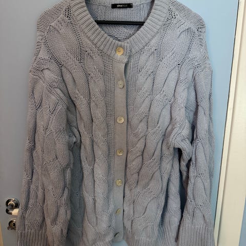 Figursydd cardigan med knapper foran. Cardiganen er hvit og har finstrikket kvalitet. Den har v-ringning, langt erme og vanlig passform. Helt ny og ubrukt, prislappen sitter fortsatt på. Størrelse medium.