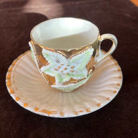 Koppen er i porselen har ikke skålen. Mønsteret er opphøyd/ tredimensjonalet. Jeg kan sende porto kommer i tillegg på 69kr med sporing. Jeg har vipps tar også kontanter. Har fiks ferdig.