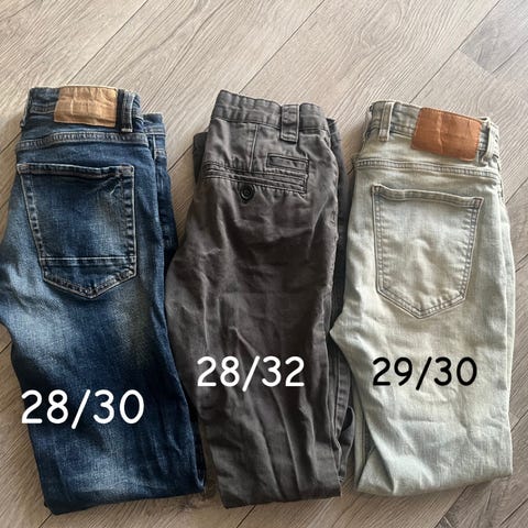 Buksene er hele og pene, de to lyseste har noe flekker ved bena, se bilder. Den ene av de lyseste gis bort på kjøpet pga lett misfarging nederst. justerbar midje for bedre passform. Passer til barn i alderen ca. 11-13 år.