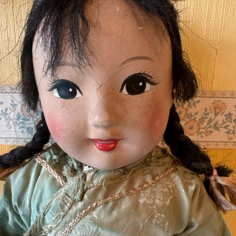 Søt kinesisk souvenirdukke, trolig fra 60/70-tallet. Hun har på seg tradisjonelle klær og pynt. Kroppen er i hard plast, med bevegelige ledd. Hun er i ganske god stand selv om noen små bruksmerker kan forekomme. Følger nedre del av esken hun lå i, er slitasjer på den.